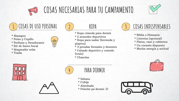 * Ropa cómoda para dormir * 2 atuendos deportivos * Ropa para nadar (bermuda y playera) * 3 prendas formales y desentes * Calzado deportivo y comodo (tenis) * Chanclas