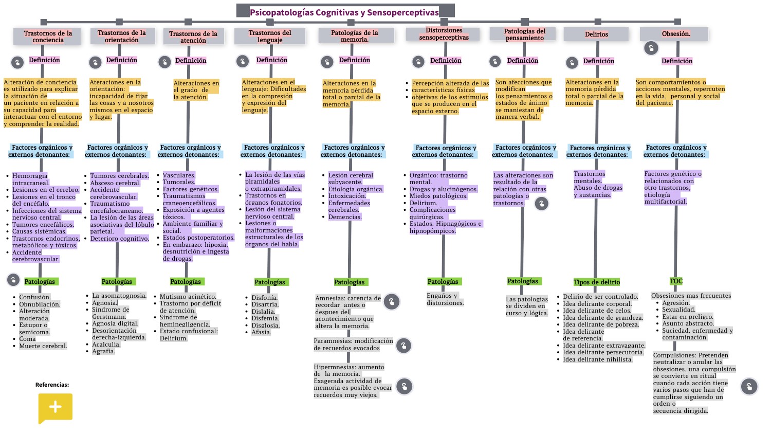 Belloch, A., Sandín, B., & Ramos, B. (2008). Manual de psicología [Version en línea] (Vol. 1). McGRAW-HILL/INTERAMERICANA. Recuperado el 15 de julio de 2023, de https://repositori.uji.es/xmlui/bitstream/handle/10234/187801/BellochA_Manual%20de%20psicopatolog%C3%ADa.pdf?sequence=1 Instituto Nacional de las Personas Adultas Mayores. (2023). Salud mental en personas mayores. Recuperado el 16 de julio de 2023, de Gobierno de México: https://www.gob.mx/inapam/articulos/salud-mental-en-personas-mayores Meneses, S. (2004). Trastornos de la atención. Revista Electrónica Sinéctica, 25, 67-74. Recuperado el 15 de julio de 2023, de https://www.redalyc.org/articulo.oa?id=99815899009 Organización Mundial de Salud. (2023). La salud mental y los adultos mayores. Recuperado el 15 de julio de 2023, de Organización Mundial de Salud: https://www.who.int/es/news-room/fact-sheets/detail/la-salud-mental-y-los-adultos-mayores Padilla Zambrano, H. S., Ramos Villegas, Y., Manjarrez Sulbaran, J. d., Pereira Cabeza, J., Pájaro Mojica, R. A., Andrade López, A., . . . Moscote Salazar, L. R. (2018). Coma y alteraciones del estado de conciencia: revisión y enfoque para el médico de urgencias. Revista Chilena de Neurocirugía, 44, 89-97. Recuperado el 15 de julio de 2023, de https://www.neurocirugiachile.org/pdfrevista/v44_n1_2018/padilla-zambrano_p89_v44n1_2018.pdf Portellano, J. A. (2005). Introducción a la neuropsicología. McGRAW-HILL. Recuperado el 15 de julio de 2023 Uriarte Bonilla, V. R. (2013). Funciones cerebrales y psicopatología [Versión en línea]. México: Editorial Alfil. Recuperado el 14 de julio de 2023, de https://psicologiaen.files.wordpress.com/2017/05/uriarte-funciones-cerebrales-y-psicopatologias.pdf