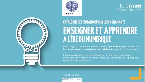 Ce catalogue de formations vous est présenté par l’AFPP en partenariat avec le Conservatoire national des arts et métiers des Pays de la Loire (Cnam). Il vise à vous proposer des formations clé en main pour enrichir vos connaissances et monter en compétences dans le domaine de la pédagogie sous l’angle du numérique.
