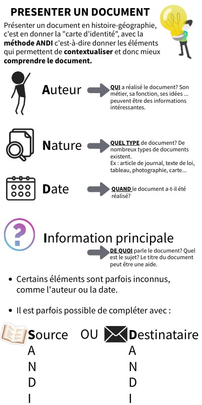 Présenter un document en histoire-géographie, c'est en donner la "carte d'identité", avec la méthode ANDI c'est-à-dire donner les éléments qui permettent de contextualiser et donc mieux comprendre le document.