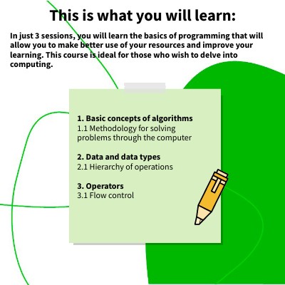 In just 3 sessions, you will learn the basics of programming that will allow you to make better use of your resources and improve your learning. This course is ideal for those who wish to delve into computing.