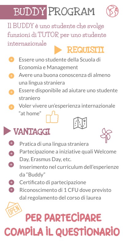 Essere uno studente della Scuola di Economia e Management Avere una buona conoscenza di almeno una lingua straniera Essere disponibile ad aiutare uno studente straniero Voler vivere un’esperienza internazionale “at home”