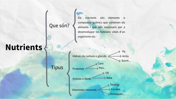 Els nutrients són les substàncies que formen els aliments. Podem trobar els següents: Hidrats de carboni o glúcids: Ens proporcionen energia i es poden obtindre principalment de productes d’origen vegetal com els cereals, la remolatxa i la canya de sucre. Proteïnes: Nutrients que faciliten el creixement i la reparació dels teixits del cos humà. Es troben en aliments d’origen animal com la carn, els ous, el peix i la llet i els lactis. I també en aliments d’origen vegetal, com les llavors. Greixos o lípids: Proporcionen una energia que si no es consumix, s’emmagatzema en el cos. Es troba en aliments d’origen vegetal com els olis i en aliments d’origen animal, com el sagí i la cansalada. Vitamines i minerals: Serveixen perquè les funcions vitals es realitzen correctament (relació, nutrició i reproducció). Es troben, majoritàriament, en les fruites i les hortalisses fresques.