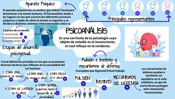 Investigó y definio la histeria de conversión.Trabajó en los siguientes aspectos: la interpretación de los sueños, la materia de las pulsiones, los actos fallidos, los mecanismos de defensa. Para Freud hay 3 niveles de conciencia: Consciente, Preconsciente e Insconsciente. En la estructura de la personalidad sostuvo que existen: el ello, el yo y el superyó.