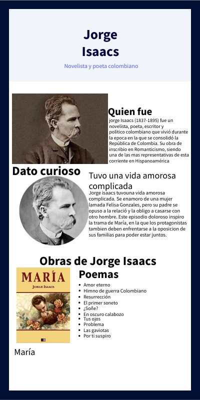 jorge Isaacs (1837-1895) fue un novelista, poeta, escritor y politico colombiano que vivió durante la epoca en la que se consolidó la República de Colombia. Su obra de inscribio en Romanticismo, siendo una de las mas representativas de esta corriente en Hispanoamérica