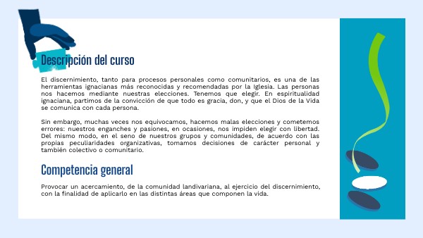 El discernimiento, tanto para procesos personales como comunitarios, es una de las herramientas ignacianas más reconocidas y recomendadas por la Iglesia. Las personas nos hacemos mediante nuestras elecciones. Tenemos que elegir. En espiritualidad ignaciana, partimos de la convicción de que todo es gracia, don, y que el Dios de la Vida se comunica con cada persona. Sin embargo, muchas veces nos equivocamos, hacemos malas elecciones y cometemos errores: nuestros enganches y pasiones, en ocasiones, nos impiden elegir con libertad. Del mismo modo, en el seno de nuestros grupos y comunidades, de acuerdo con las propias peculiaridades organizativas, tomamos decisiones de carácter personal y también colectivo o comunitario.