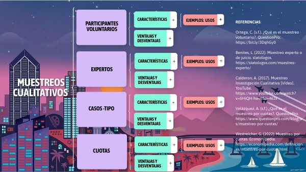 REFERENCIAS: Ortega, C. (s.f.). ¿Qué es el muestreo voluntario?. QuestionPro. https://bit.ly/3DqhGy0 Benites, L. (2022). Muestreo experto o de juicio. statologos. https://statologos.com/muestreo-experto/ Calderon, A. (2017). Muestreo Investigación Cualitativa [Vídeo]. YouTube. https://www.youtube.com/watch?v=liHiQH-hwvc&t=461s Velázquez, A. (s.f.) ¿Qué es el muestreo por cuotas?. QuestionPro. https://www.questionpro.com/blog/es/muestreo-por-cuotas/ Westreicher, G. (2022). Muestreo por cuotas. Economipedia. https://economipedia.com/definiciones/muestreo-por-cuotas.html