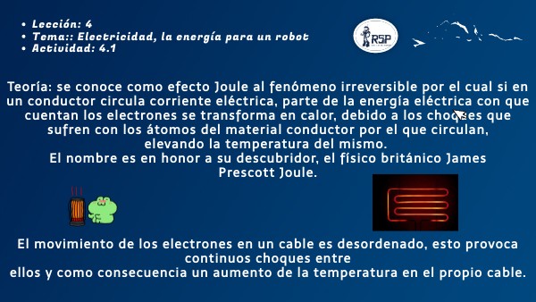 Teoría: se conoce como efecto Joule al fenómeno irreversible por el cual si en un conductor circula corriente eléctrica, parte de la energía eléctrica con que cuentan los electrones se transforma en calor, debido a los choques que sufren con los átomos del material conductor por el que circulan,elevando la temperatura del mismo. El nombre es en honor a su descubridor, el físico británico James Prescott Joule. El movimiento de los electrones en un cable es desordenado, esto provoca continuos choques entre ellos y como consecuencia un aumento de la temperatura en el propio cable.