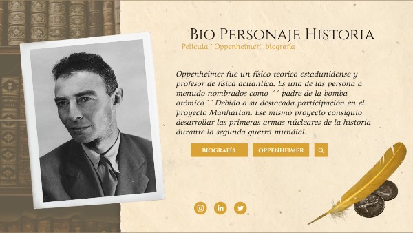 Oppenheimer fue un físico teorico estadunidense y profesor de física acuantíca. Es una de las persona a menudo nombrados como ´´ padre de la bomba atómica´´ Debido a su destacada participación en el proyecto Manhattan. Ese mismo proyecto consiguio desarrollar las primeras armas núcleares de la historia durante la segunda guerra mundial.