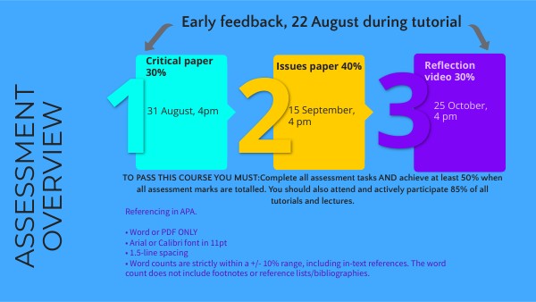 TO PASS THIS COURSE YOU MUST:Complete all assessment tasks AND achieve at least 50% when all assessment marks are totalled. You should also attend and actively participate 85% of all tutorials and lectures.