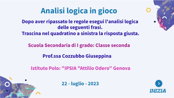 Dopo aver ripassato le regole esegui l'analisi logica delle seguenti frasi. Trascina nel quadratino a sinistra la risposta giusta.