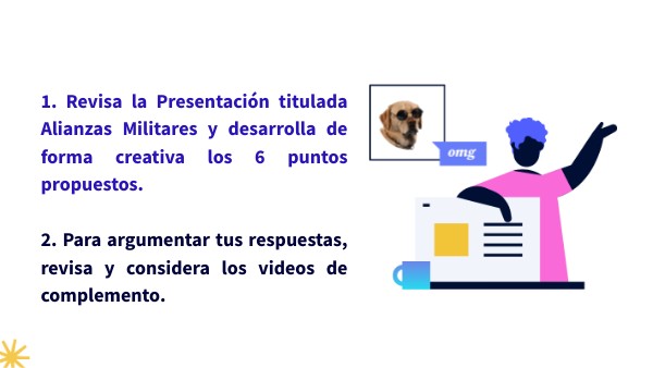 1. Revisa la Presentación titulada Alianzas Militares y desarrolla de forma creativa los 6 puntos propuestos. 2. Para argumentar tus respuestas, revisa y considera los videos de complemento.