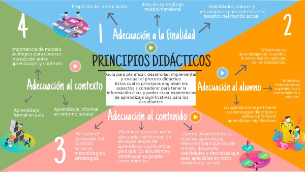 Guía para planificar, desarrollar, implementar y evaluar el proceso didáctico. Estos cuatro principios engloban los aspectos a considerar para tener la información clara y poder crear experiencias de aprendizaje significativas para los estudiantes.