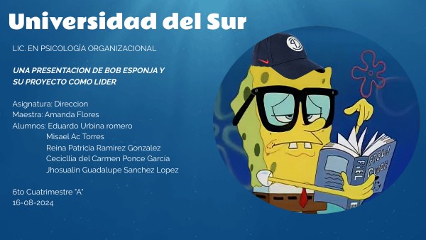 LIC. EN PSICOLOGÍA ORGANIZACIONAL UNA PRESENTACION DE BOB ESPONJA Y SU PROYECTO COMO LIDER Asignatura: Direccion Maestra: Amanda Flores Alumnos: Eduardo Urbina romero Misael Ac Torres Reina Patricia Ramirez Gonzalez Cecicllia del Carmen Ponce García Jhosualin Guadalupe Sanchez Lopez 6to Cuatrimestre "A" 16-08-2024