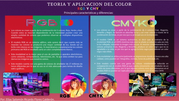 - Los colores se crean a partir de la combinación de 3 colores: Rojo, Verde y Azul. Cuando estos se mezclan dependiendo de la intensidad pueden crear una amplia cantidad de colores que podemos observar en múltiples dispositivos electrónicos.