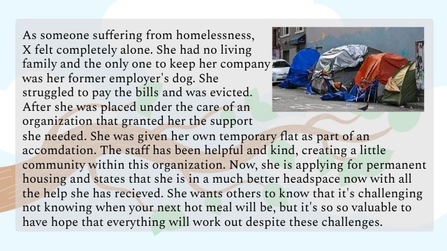 she needed. She was given her own temporary flat as part of an accomdation. The staff has been helpful and kind, creating a little community within this organization. Now, she is applying for permanent housing and states that she is in a much better headspace now with all the help she has recieved. She wants others to know that it's challenging not knowing when your next hot meal will be, but it's so so valuable to have hope that everything will work out despite these challenges.