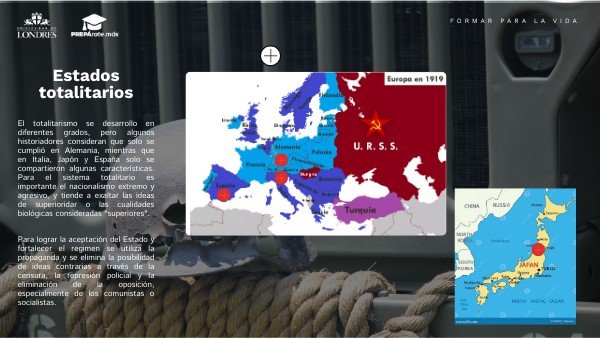 El totalitarismo se desarrollo en diferentes grados, pero algunos historiadores consideran que solo se cumplió en Alemania, mientras que en Italia, Japón y España solo se compartieron algunas características. Para el sistema totalitario es importante el nacionalismo extremo y agresivo, y tiende a exaltar las ideas de superioridar o las cualidades biológicas consideradas "superiores". Para lograr la aceptación del Estado y fortalecer el regimen se utiliza la propaganda y se elimina la posibilidad de ideas contrarias a través de la censura, la represión policial y la eliminación de la oposición, especialmente de los comunistas o socialistas.