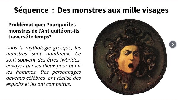 1) Origine et nom en grec - 2) parents, frères et soeurs - 3) caractéristiques physiques - 4) caratéristiques morales - 5) alliés et ennemis - 6) héritage dans la culture contemporaine 4. Choisissez des illustrations ( une image emblématique - une image du corps entier - deux images de détails - une image dans la culture contemporaine) 5. Préparez deux questions pour vérifier la compréhension de vos camarades , les réponses à des questions sur le sens des mots, les idées principales, ce que vous ont apporté les recherches.Les monstres à travers le temps