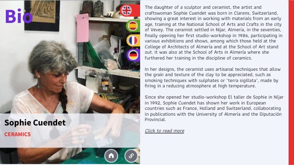Hija de escultor y ceramista, la artista y artesana Sophie Cuendet nace en Clarens, Suiza, mostrando desde pequeña un gran interés por el trabajo de los materiales, formándose en la Escuela Nacional de Artes y Oficios de la ciudad de Vevey. La ceramista se instaló en Nijar, Almería, en la década de los setenta, abriendo finalmente su primer estudio-taller en 1986, participando en diversas exposiciones y muestras, entre las que destacan las realizadas en el Colegio de Arquitectos de Almería, y en la Escuela de Arte. Fue también en la Escuela de Artes de Almería donde amplió su formación en la disciplina de la cerámica. En sus diseños, la ceramista emplea técnicas artesanales que permiten apreciar el grano y la textura de la arcilla, como es el caso de técnicas de ahumado con sulfatos o ‘terra sigillata’, realizada con cocciones en atmósfera reductora en alta temperatura. Desde que abrió su Estudio-Taller El taller de Sophie en Níjar en el año 1992, Sophie Cuendet ha mostrado su obra en países europeos como Francia, Holanda y Suiza, colaborando en publicaciones junto con la Universidad de Almería o la Diputación Provincial. Dedicándose a una clientela particular y coleccionista, el Taller de Sophie posee el reconocimiento de Punto de Interés Artesanal, otorgado por la Junta de Andalucía. Pulse para leer más