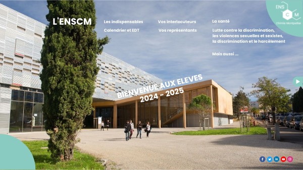 prénom.nom@enscm.fr A utiliser pour toute communication avec l’école et consultable via votre Espace Numérique de Travail (ENT). prénom.nom@umontpellier.fr A utiliser pour toute communication avec l'Université de Montpellier