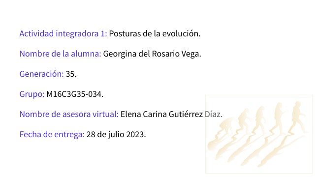 Actividad integradora 1: Posturas de la evolución.Nombre de la alumna: Georgina del Rosario Vega. Generación: 35. Grupo: M16C3G35-034. Nombre de asesora virtual: Elena Carina Gutiérrez Díaz. Fecha de entrega: 28 de julio 2023.