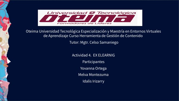 Oteima Universidad Tecnológica Especialización y Maestría en Entornos Virtuales de Aprendizaje Curso Herramienta de Gestión de Contenido Tutor: Mgtr. Celso Samaniego Actividad 4. EX ELEARNIG Participantes Yovanna Ortega Melva Montezuma Idalis Irizarry