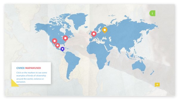 Click on the markers to see some examples of kinds of citizenship around the world, violence or exclusion.