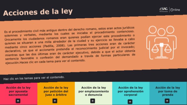 Es el procedimiento civil más antiguo dentro del derecho romano, estos eran actos jurídicos solemnes y verbales, mediante los cuales se iniciaba el procedimiento contencioso. Únicamente los ciudadanos romanos eran quienes podían ejercer este procedimiento o quienes se situaran a una milla alrededor de la ciudad y su ejercicio se llevaba a cabo mediante cinco acciones (Padilla, 2008). Las primeras tres acciones eran de carácter declarativo, ya que el accionante pretendía el reconocimiento judicial por el invocado; mientras que las dos últimas eran de carácter ejecutivo, debido a que el actor obtenía sentencia favorable o confesión del demandado a través de formas particulares de ejecución.Haces clic en cada tema para ver el contenido.