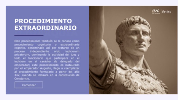 Este procedimiento también se le conoce como procedimiento cognitorio o extraordinaria cognitio, denominado así por tratarse de un proceso independiente ordo iudiciorum privatorum, dominando la actividad del juez y todo el funcionario que participara en el iudicium en el carácter de delegado del emperador; este procedimiento es instaurado por el emperador Augusto, llega a reemplazar al procedimiento formulario a partir del año 342, cuando se instaura en la constitución de Constancio.