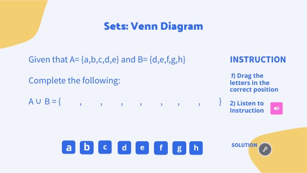 This Venn Diagram Activity is an interactive creation that will aid students who struggle to draw or write effectively. It contains in written and audio form along with feedback on solutions.