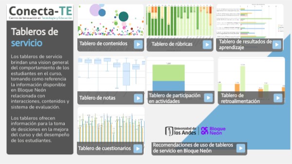 Los tableros de servicio brindan una vision general del comportamiento de los estudiantes en el curso, tomando como referencia la información disponible en Bloque Neón relacionada con interacciones, contenidos y sistema de evaluación. Los tableros ofrecen información para la toma de desiciones en la mejora del curso y del desempeño de los estudiantes.