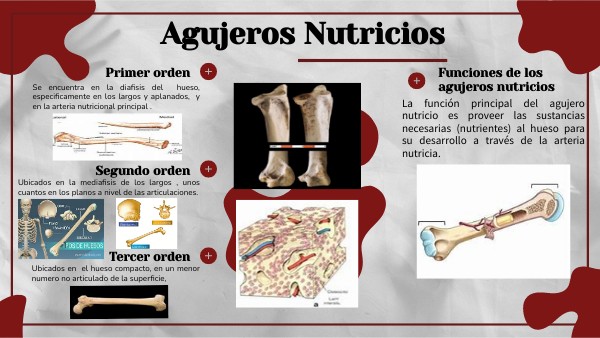 La función principal del agujero nutricio es proveer las sustancias necesarias (nutrientes) al hueso para su desarrollo a través de la arteria nutricia.