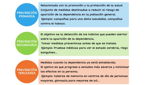 Medidas cuando la dependencia ya está establecida. El ojetivo es que progrese a estados más severos y minimizar los efectos en la persona. Ejemplo: talleres de memoria en centros de día de personas mayores, gimnasia para meyores de 60...