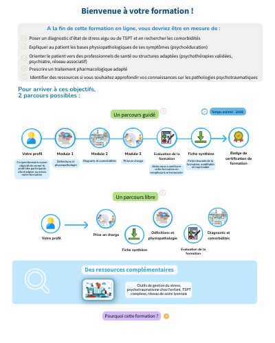 Le Trouble de Stress Post Traumatique (TSPT) est une pathologie fréquente souvent associée à de nombreuses comorbidités qui peuvent rendre le diagnostic difficile. Ces patient ont régulièrement recours aux soins primaires mais bénéficient rarement d'un diagnostic et d'un traitement approprié. Le but de cette formation est de permettre aux médecins généralistes de dépister précocement le TSPT et mettre rapidement en place une prise en charge adaptée.