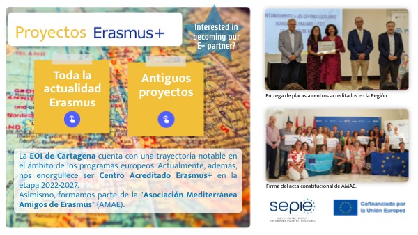 La EOI de Cartagena cuenta con una trayectoria notable en el ámbito de los programas europeos. Actualmente, además, nos enorgullece ser Centro Acreditado Erasmus+ en la etapa 2022-2027.Asimismo, formamos parte de la "Asociación Mediterránea Amigos de Erasmus" (AMAE).