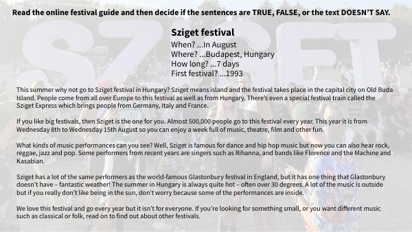 This summer why not go to Sziget festival in Hungary? Sziget means island and the festival takes place in the capital city on Old Buda Island. People come from all over Europe to this festival as well as from Hungary. There’s even a special festival train called the Sziget Express which brings people from Germany, Italy and France. If you like big festivals, then Sziget is the one for you. Almost 500,000 people go to this festival every year. This year it is from Wednesday 8th to Wednesday 15th August so you can enjoy a week full of music, theatre, film and other fun. What kinds of music performances can you see? Well, Sziget is famous for dance and hip hop music but now you can also hear rock, reggae, jazz and pop. Some performers from recent years are singers such as Rihanna, and bands like Florence and the Machine and Kasabian. Sziget has a lot of the same performers as the world-famous Glastonbury festival in England, but it has one thing that Glastonbury doesn’t have – fantastic weather! The summer in Hungary is always quite hot – often over 30 degrees. A lot of the music is outside but if you really don’t like being in the sun, don’t worry because some of the performances are inside. We love this festival and go every year but it isn’t for everyone. If you’re looking for something small, or you want different music such as classical or folk, read on to find out about other festivals.