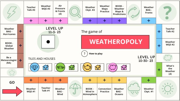 Each player must select a player color and place their game piece on GO. Move your game piece to each game square as you advance throught the Weatheropogy game. Once you complete the activity in each square, place a house tile of your color on that spot. When you need a brain break and want to risk a "CHANCE CARD" roll the dice. See the instructions on your table to see what your CHANCE task is. MAXIMUM IS 2 time / day! Special Squares: make sure. you click on the special squares. There are interactive questions, videos and other fun activities to enhance your game experience. Once you have a property on each square, you will be ready for your Weather Test! Have fun and while learning about Weather!