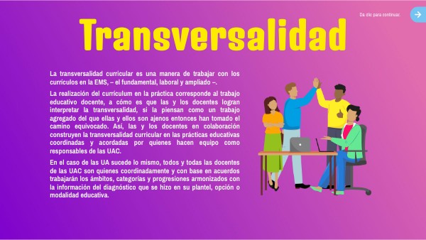 La transversalidad curricular es una manera de trabajar con los currículos en la EMS, – el fundamental, laboral y ampliado –. La realización del currículum en la práctica corresponde al trabajo educativo docente, a cómo es que las y los docentes logran interpretar la transversalidad, si la piensan como un trabajo agregado del que ellas y ellos son ajenos entonces han tomado el camino equivocado. Así, las y los docentes en colaboración construyen la transversalidad curricular en las prácticas educativas coordinadas y acordadas por quienes hacen equipo como responsables de las UAC. En el caso de las UA sucede lo mismo, todos y todas las docentes de las UAC son quienes coordinadamente y con base en acuerdos trabajarán los ámbitos, categorías y progresiones armonizados con la información del diagnóstico que se hizo en su plantel, opción o modalidad educativa.