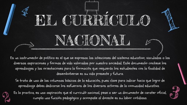 Es un instrumento de política en el que se expresan las intenciones del sistema educativo, vinculadas a las diversas aspiraciones y formas de vida valoradas por nuestra sociedad. Este documento contiene los aprendizajes y las orientaciones para la formación que requierán los estudientes con la finalidad de desembolverse en su vida presente y futura. Se trata de una de las columnas básicas de la educación, pues clave para indicar hacia que logro de aprendizaje deben dedicarse los esfuerzos de los diversos actores de la comunidad educativa. En la practica, es una aspiración que el curriculó nacional, pese a ser un documento de carater oficial, cumpla una fucnión pedagógica y acompañe al docente en su labor cotidiana.