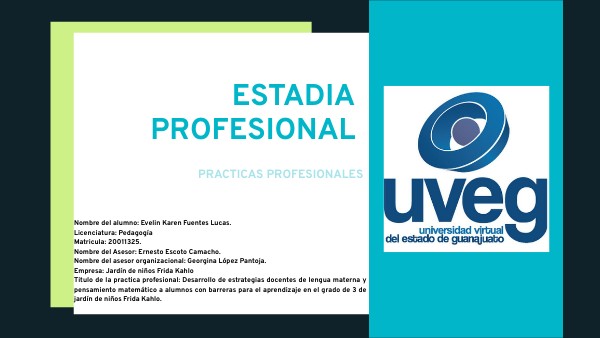 Licenciatura: Pedagogía Matricula: 20011325. Nombre del Asesor: Ernesto Escoto Camacho. Nombre del asesor organizacional: Georgina López Pantoja. Empresa: Jardín de niños Frida Kahlo Titulo de la practica profesional: Desarrollo de estrategias docentes de lengua materna y pensamiento matemático a alumnos con barreras para el aprendizaje en el grado de 3 de jardín de niños Frida Kahlo.