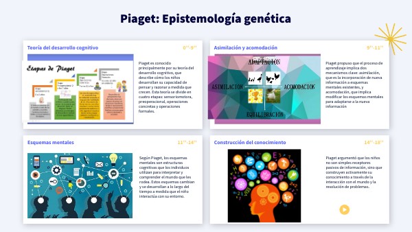 Piaget es conocido principalmente por su teoría del desarrollo cognitivo, que describe cómo los niños desarrollan su capacidad de pensar y razonar a medida que crecen. Esta teoría se divide en cuatro etapas: sensoriomotora, preoperacional, operaciones concretas y operaciones formales.
