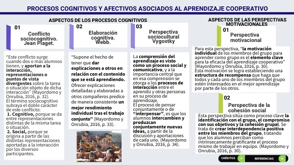 -Mayordomo, R. M. y Onrubia, J. (2016). El aprendizaje cooperativo. Barcelona, España, Editorial UOC. Recuperado de https://elibro.net/es/lc/bibliotecauveg/titulos/58518 -Ramírez, P. (s.f.) Lección 4. Procesos cognitivos que explican la efectividad del aprendizaje cooperativo. Recuperado de Universidad Virtual del Estado de Guanajuato [UVEG]. -Ramírez, P. (s.f.) Lección 5. Procesos motivacionales y afectivos que explican la efectividad del aprendizaje cooperativo. Recuperado de Universidad Virtual del Estado de Guanajuato [UVEG].