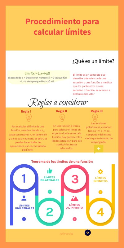 Cálculo de límites. (s.f.). Recuperado de: https://www.ieszaframagon.com/matematicas/matematicas2/limite_continua_b/2_clculo_de_lmites.html Concepto intuitivo de límite. (s.f.). Recuperado de: https://prometeo.matem.unam.mx/recursos/Bachillerato/DGEE_DGTIC_IMATE/recursos/3_004/index.html#:~:text=El%20l%C3%ADmite%20de%20una%20funci%C3%B3n,a%20%2B%E2%88%9E%20o%20a%20%E2%88%92%E2%88%9E. González, N. (2021)- Límites y continuidad. Recuperado de https://i.pinimg.com/originals/55/a6/d3/55a6d349338b90bff5644310c68db325.jpg Khan Academy. (s.f.). Límites unilaterales a partir de gráficas. Recuperado de: https://es.khanacademy.org/math/ap-calculus-ab/ab-limits-new/ab-1-3/v/one-sided-limits-from-graphs#:~:text=Un%20l%C3%ADmite%20unilateral%20es%20el,no%20est%C3%A1%20definida%20en%200. Matemáticas Once. (s.f.) Límites bilaterales. Recuperado de: http://matematicasoncejulio.blogspot.com/p/limites-bilaterales.html