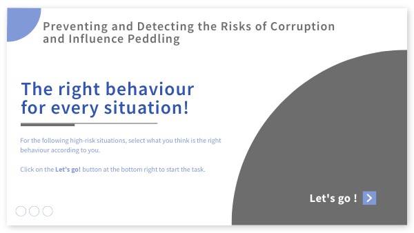 For the following high-risk situations, select what you think is the right behaviour according to you. Click on the Let’s go! button at the bottom right to start the task.
