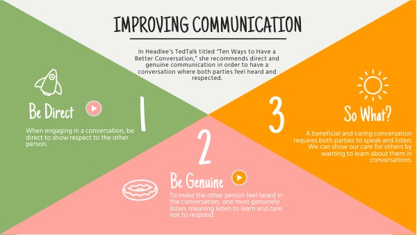 In Headlee’s TedTalk titled “Ten Ways to Have a Better Conversation,” she recommends direct and genuine communication in order to have a conversation where both parties feel heard and respected.