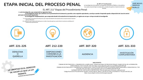 CÁMARA DE DIPUTADOS DEL H. CONGRESO DE LA UNIÓN (2023). CÓDIGO NACIONAL DE PROCESOS PENALES. DIARIO OFICIAL DE LA FEDERACIÓN. CONSULTADO EL 27 DE JULIO DEL 2023, DE: https://www.diputados.gob.mx/LeyesBiblio/pdf/CNPP.pdfCÁMARA DE DIPUTADOS DEL H. CONGRESO DE LA UNIÓN (2023). CPNSTITUCIÓN POLÍTICA DE LOS ESTADOS UNIDOS MEXICANOS, CONSULTADO EL 27 DE JULIO DEL 2023, DE: https://www.diputados.gob.mx/LeyesBiblio/pdf/CPEUM.pdf SUPREMA CORTE DE JUSTICIA DE LA NACIÓN (2014). Guía de apoyo para el estudio y aplicación del Código Nacional de Procedimientos Penales. Primera edicion, México. [Versión el Linea] consultado el 27 de julio del 2023, de: https://www.cjf.gob.mx/documentos/guiacnpp.pdf