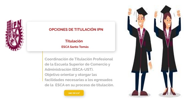 Coordinación de Titulación Profesional de la Escuela Superior de Comercio y Administración (ESCA-UST). Objetivo orientar y otorgar las facilidades necesarias a los egresados de la ESCA en su proceso de titulación.