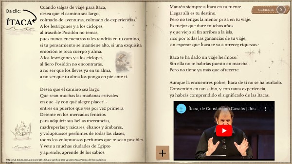 Cuando salgas de viaje para Ítaca, desea que el camino sea largo, colmado de aventuras, colmado de experiencias. A los lestrigones y a los cíclopes, al irascible Posidón no temas, pues nunca encuentros tales tendrás en tu camino, si tu pensamiento se mantiene alto, si una exquisita emoción te toca cuerpo y alma. A los lestrigones y a los cíclopes, al fiero Posidón no encontrarás, a no ser que los lleves ya en tu alma, a no ser que tu alma los ponga en pie ante ti. Desea que el camino sea largo. Que sean muchas las mañanas estivales en que -¡y con qué alegre placer! - entres en puertos que ves por vez primera. Detente en los mercados fenicios para adquirir sus bellas mercancías, madreperlas y nácares, ébanos y ámbares, y voluptuosos perfumes de todas las clases, todos los voluptuosos perfumes que te sean posibles. Y vete a muchas ciudades de Egipto y aprende, aprende de los sabios.