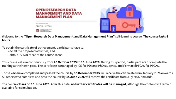 Welcome to the "Open Research Data Management and Data Management Plan" self-learning course. The course lasts 6 hours.To obtain the certificate of achievement, participants have to:- do all the proposed activities, and - obtain 65% or more of the course score.This course will run continuously from 20 October 2025 to 15 June 2026. During this period, participants can complete the training at their own pace. The certificate is managed by ICE for PDI and PhD students, and FormacióPTGAS for PTGAS.Those who have completed and passed the course by 15 December 2025 will receive the certificate from January 2026 onwards. All others who complete and pass the course by 15 June 2026 will receive the certificate from July 2026 onwards. The course closes on 15 June 2026. After this date, no further certificates will be managed, although the content will remain available for consultation.