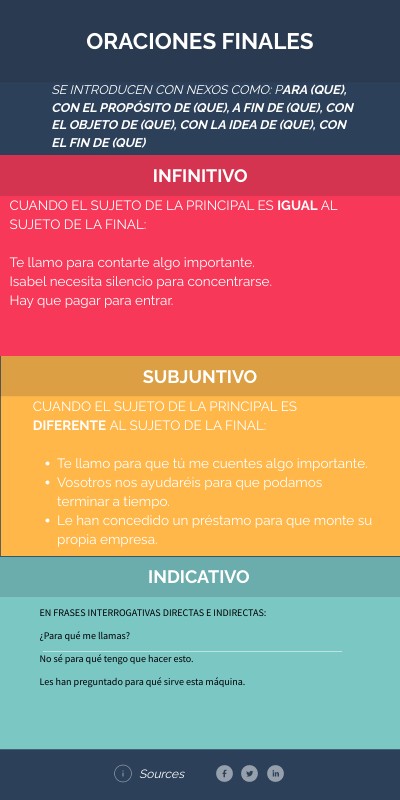 CUANDO EL SUJETO DE LA PRINCIPAL ES IGUAL AL SUJETO DE LA FINAL: Te llamo para contarte algo importante. Isabel necesita silencio para concentrarse. Hay que pagar para entrar.